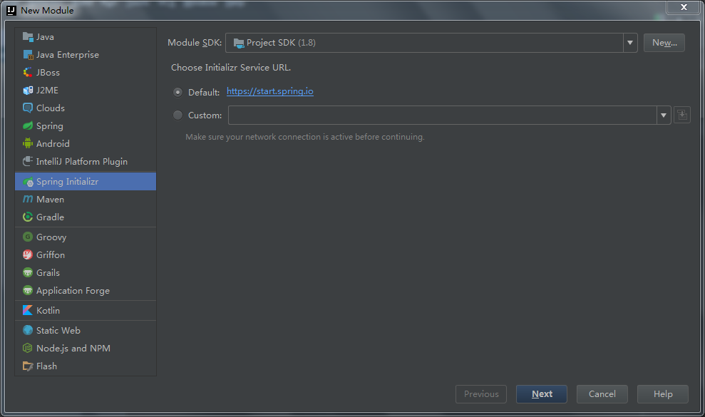 3.2.1.1 项目名称右键 >> Model >> 选择 Spring Initializr >> Module SDK:1.8;choose Initializr Service URL:Default >> [Next]