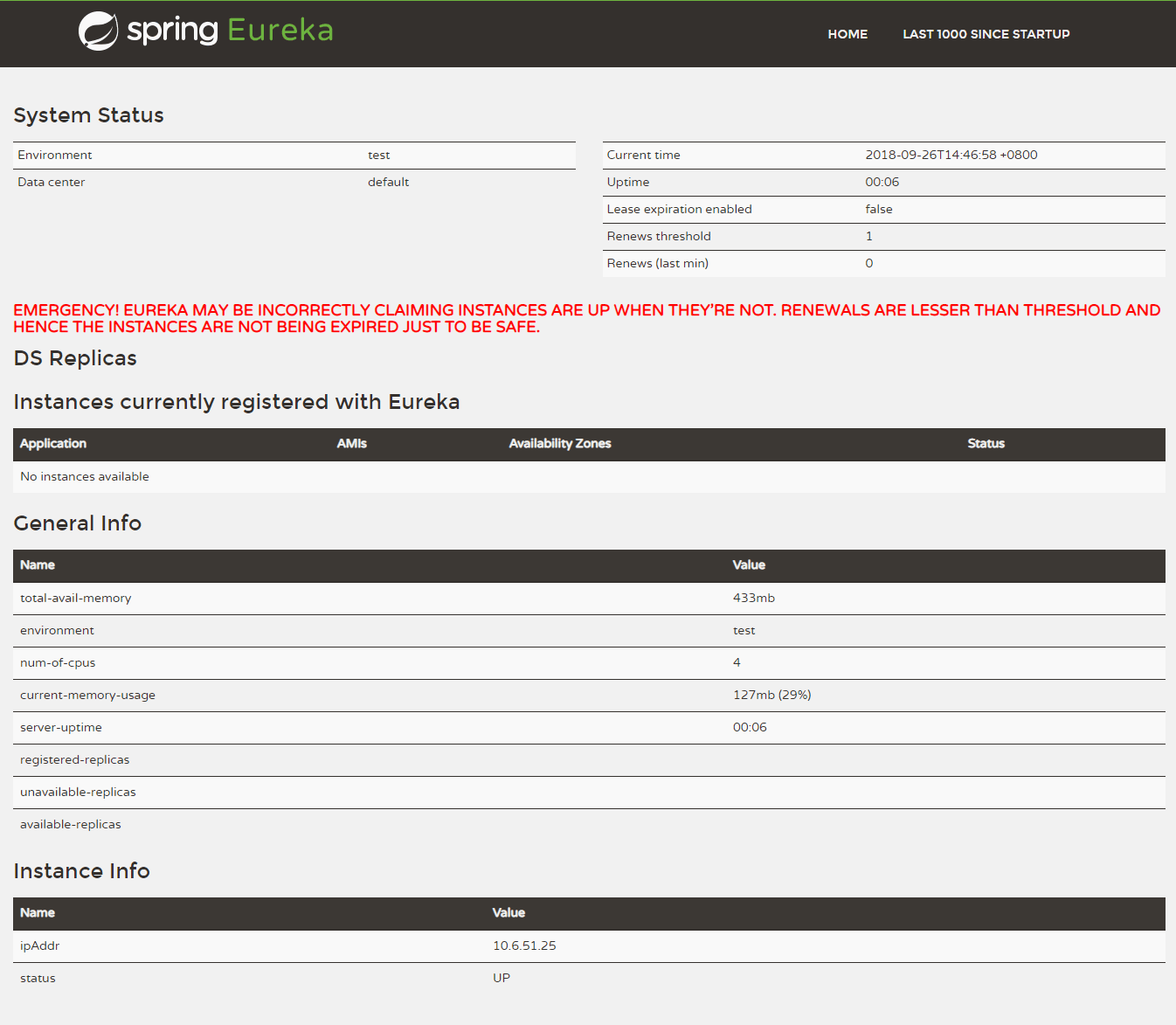 如此,一个画风干净的 Spring Cloud Eureka Server (Eureka服务注册中心)就映入眼帘。