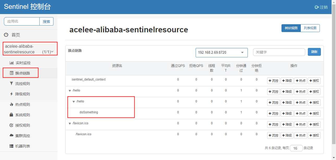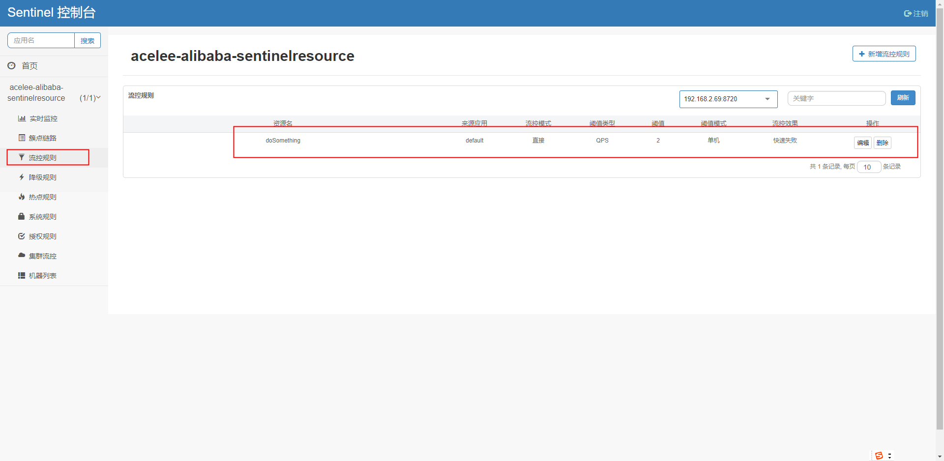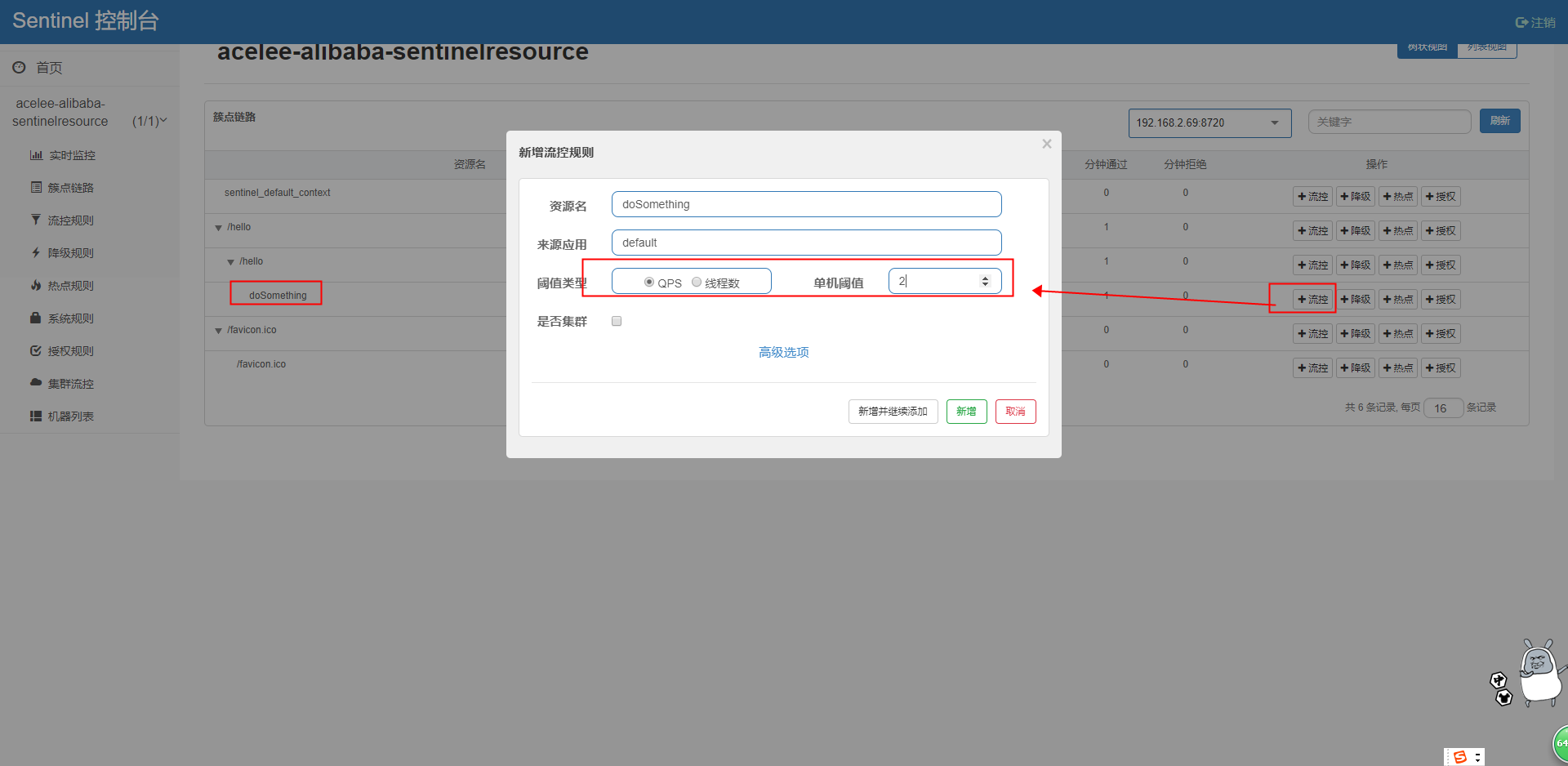 5.这个时候查看sentinel dashboard,可以看到除了如之前入门实例中那样有/hello资源点之外,多了一个doSomething资源点。可以通过界面为这个资源点设置限流规则,比如将其QPS设置为2。由于/hello资源不设置限流规则,所以只要请求/hello接口,就可以直接模拟调用doSomething资源,来观察限流规则是否生效。
