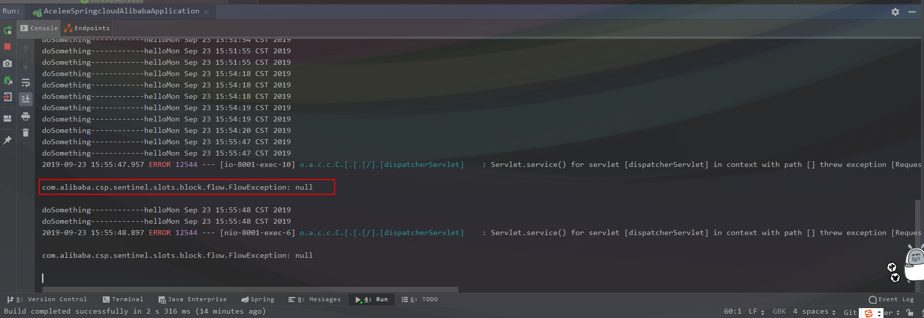 完成上面的改动之后,重新启动应用,再快速访问接口(注意限流规则需要配置好),此时前端就不会返回异常信息了,后端会打印exceptionHandler中定义的日志输出。而在实际应用的时候,只要根据业务需要对限流请求做缓存或者前端提示等都可以基于此方法来实现。
