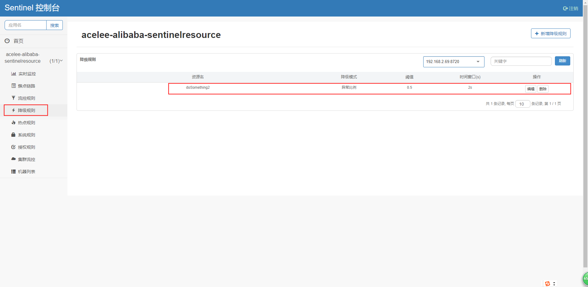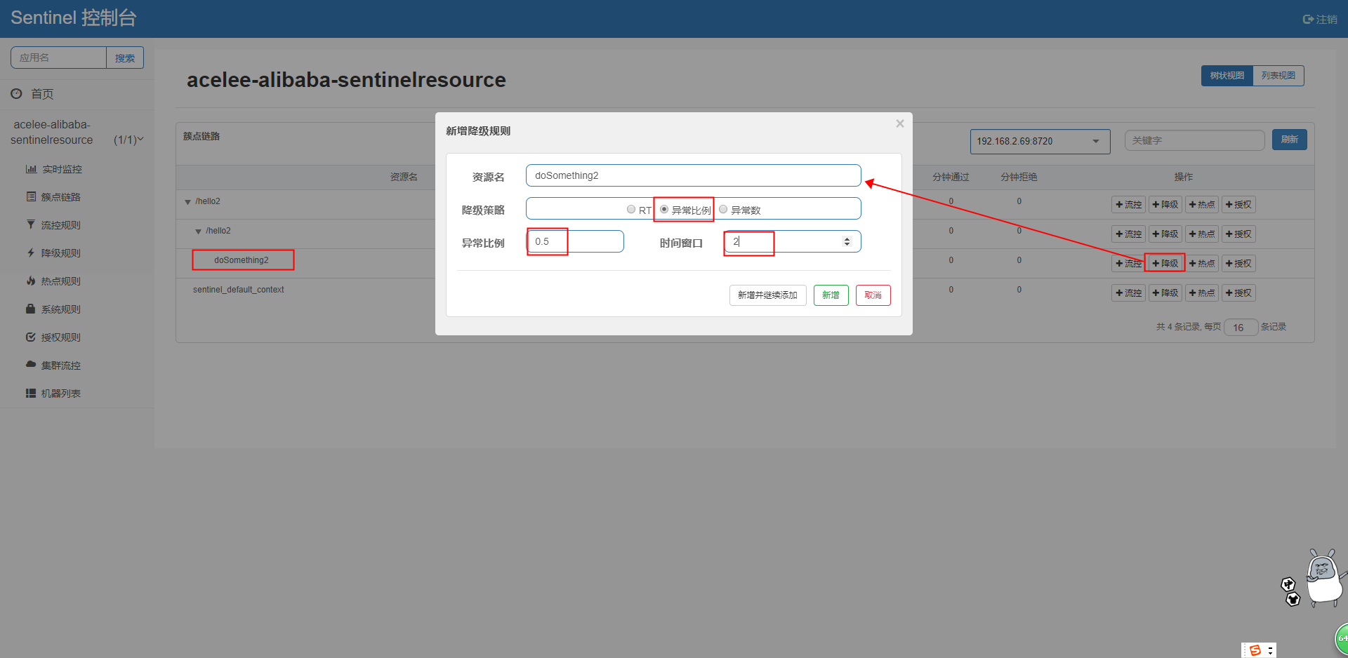 4.查看Sentinel-Dashboard,可以看到簇点链路名为doSomeThing2的资源点。然后点击”降级“按钮,为该资源设置降级规则。这里使用异常比例策略,比例设置为0.5(即:50%的异常率),时间窗口设置为2(秒)。