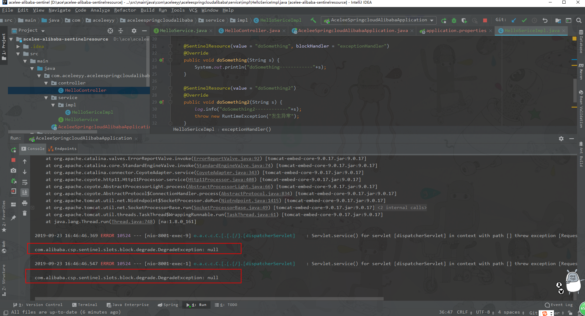 5.验证熔断降级,根据上面的降级策略配置,当doSomeThing2方法的调用QPS >= 5,如果异常率超过50%,那么后续2秒内的调用将直接出发熔断降级,默认情况会直接抛出DegradeException异常,比如: