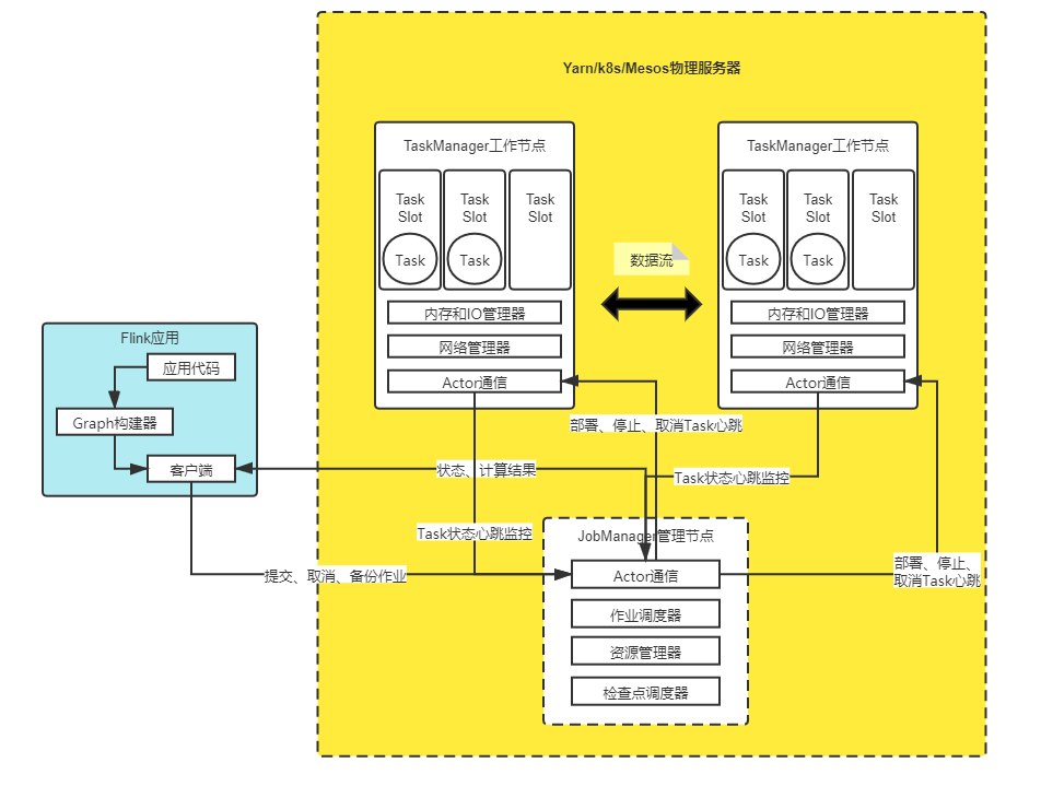 - TaskManager:接收JobManager分发的子任务,根据自身的资源情况,管理子任务的启动、停止、销毁、异常恢复等生命周期阶段。
