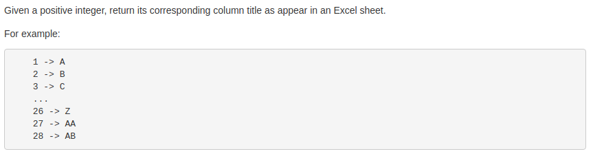 我是靠谱客的博主 淡淡水池,这篇文章主要介绍每天一道LeetCode-----将数字用字母表示(本质是26进制转换)Excel Sheet Column TitleExcel Sheet Column Number,现在分享给大家,希望可以做个参考。