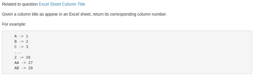 以上就是淡淡水池最近收集整理的关于每天一道LeetCode-----将数字用字母表示(本质是26进制转换)Excel Sheet Column TitleExcel Sheet Column Number的全部内容,更多相关每天一道LeetCode-----将数字用字母表示(本质是26进制转换)Excel内容请搜索靠谱客的其他文章。