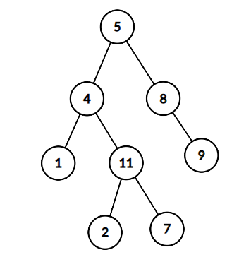 返回true,因为存在一条路径 5to 4to 11to 25→4→11→2的节点值之和为 22