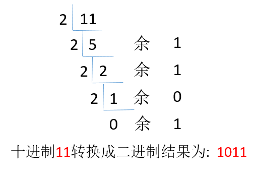 例如:把十进制11转二进制步骤如下: