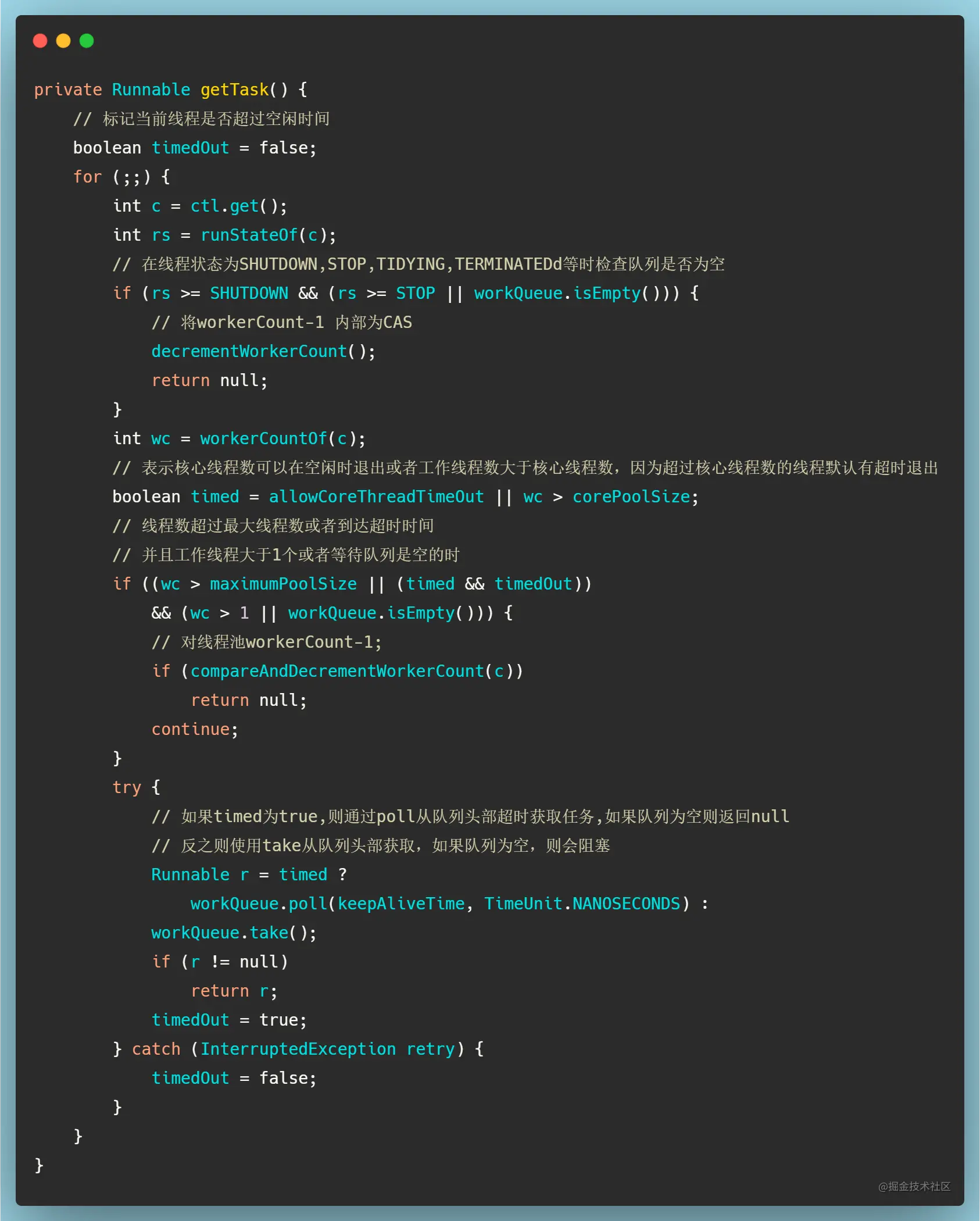 - 会根据当前线程池设置的核心线程数,最大线程数,超时时间等,从任务队列获取任务,可能会超时等待,也可能会阻塞知道任务到达;
