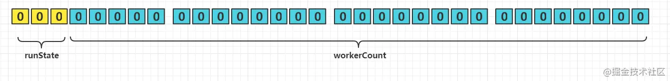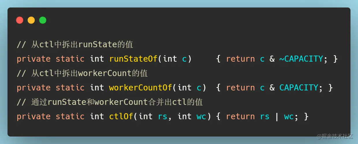 我们看到在最上面有定义一个AtomicInteger ctl这样一个原子类型的Integer,这个ctl不光可以表示线程池的运行状态,同时能够表示线程池的有效线程数workerCount。那么是怎么做到的呢?我们都知道Integer类型的内存大小是4个字节,对应32个bit,ctl将32位的高三位用来表示线程池的运行状态,低29位表示有效线程数。