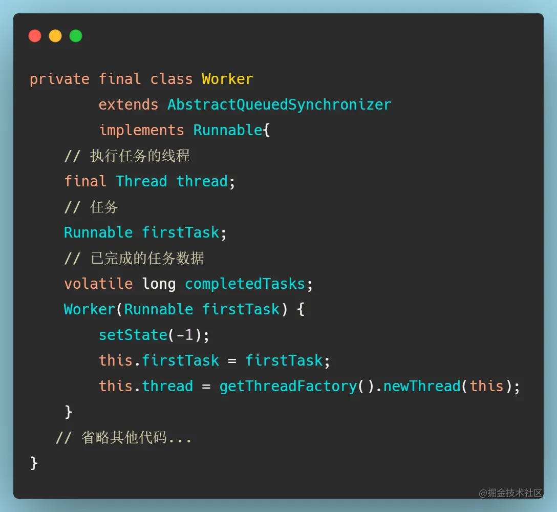 可以发现Worker类继承了AQS,并且实现Runnable接口,也就是说Worker对象可以交给一个Thread创建线程后执行。从Worker的构造方法里我们也能看出,thread是通过线程工厂创建一个线程,将this作为参数传递的。