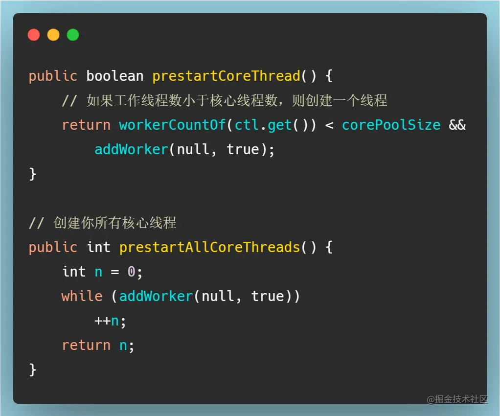 如果需要在线程池创建之后立即创建线程,ThreadPoolExecutor提供了两个方法可以实现: