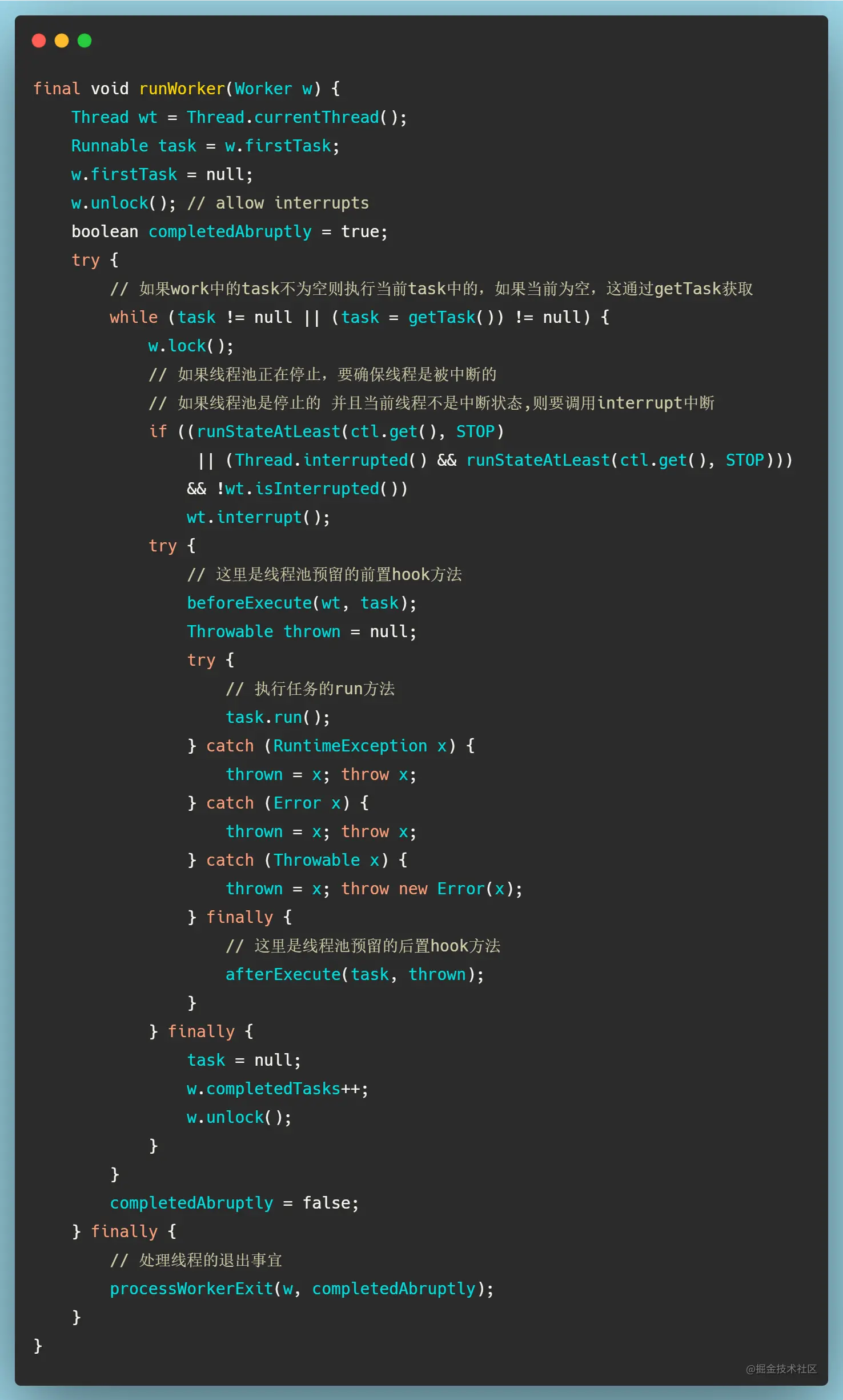 既然Worker类实现了Runnable方法,那对应run()方法中的逻辑就必须要看一下了。