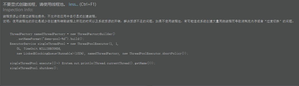 当我们使用阿里的插件进行代码规范检查的时候,线程的创建不规范总是会报一下的提示: