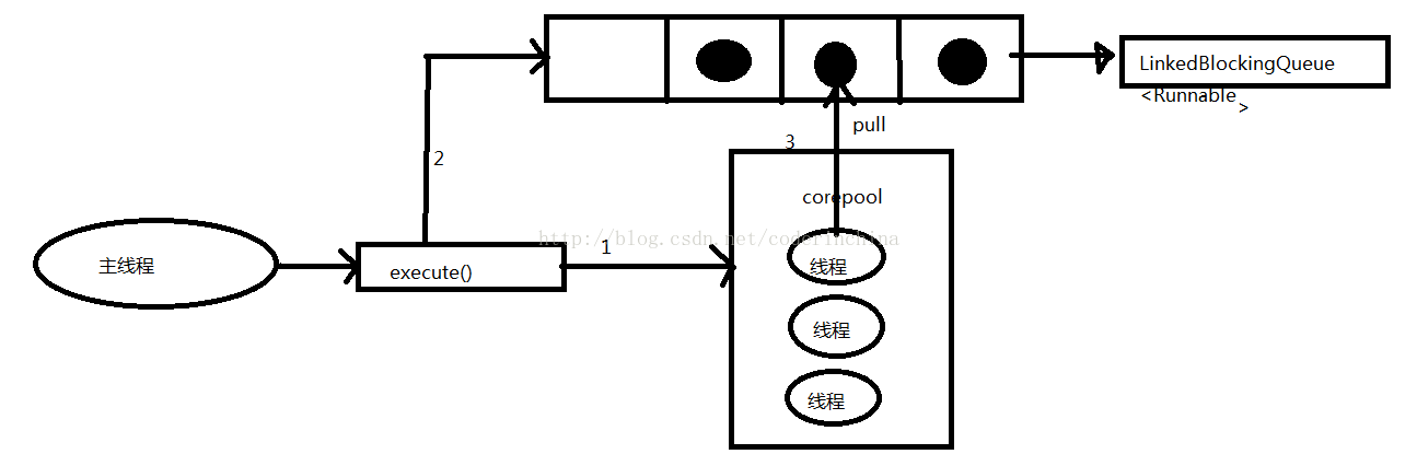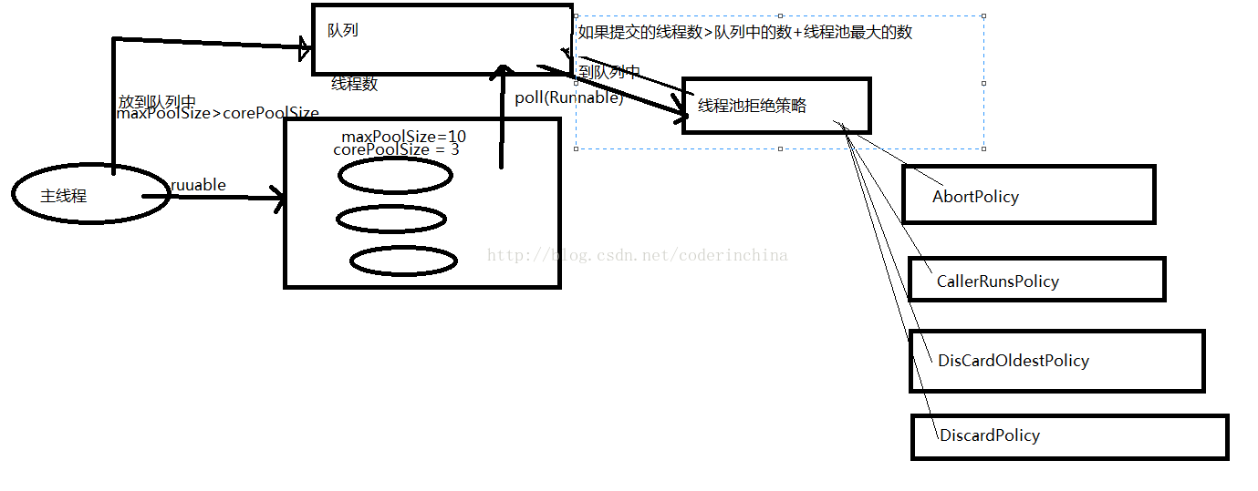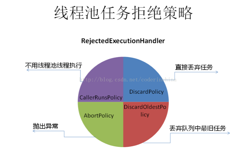7:handler(饱和策略),当队列和线程池都满了,说明线程池处于饱和状态,那么必须采取一种策略处理提交的新任务,这个策略默认情况下是AbortPolicy,表示无法处理新任务时抛出异常,在jdk1.5中线程池框架提供了4种策略:AbortPolicy:直接抛出异常CallerRunsPolicy:只用调用者所在线程来执行任务DisCardOldestPolicy:遗弃队列里最近的一个任务,并执行当前任务.DiscardPolicy:不处理,直接遗弃,来自网上的一张图: