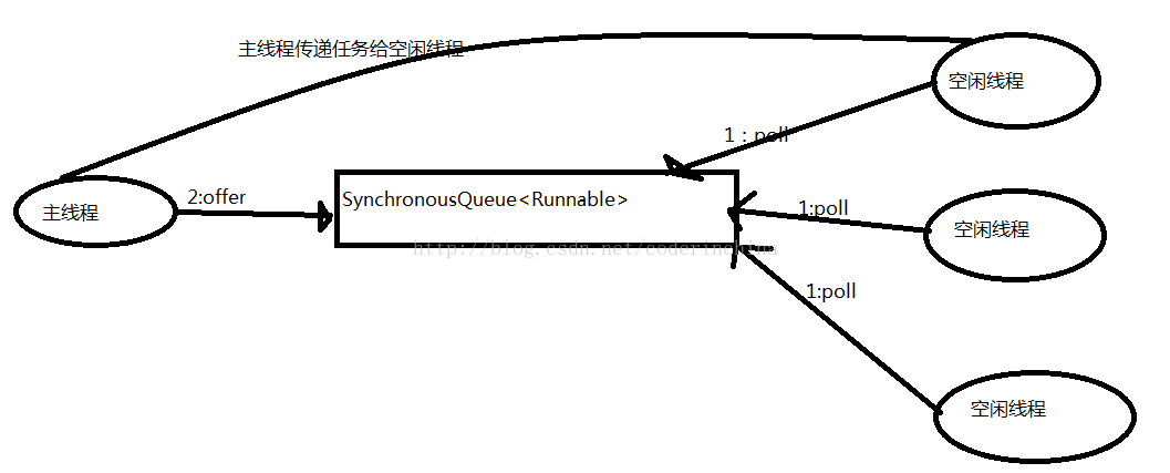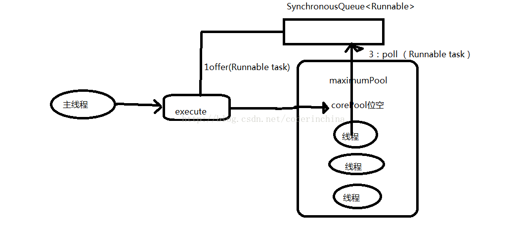 2:当初始maximumPool为空时,或者maximumPool中当前没有空闲线程时,将没有线程行SynchronousQueue.poll()