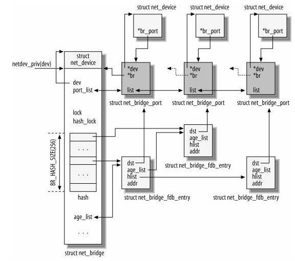 其中最左边的net_device是一个代表网桥的虚拟设备结构,它关联了一个net_bridge结构,这是网桥设备所特有的数据结构。