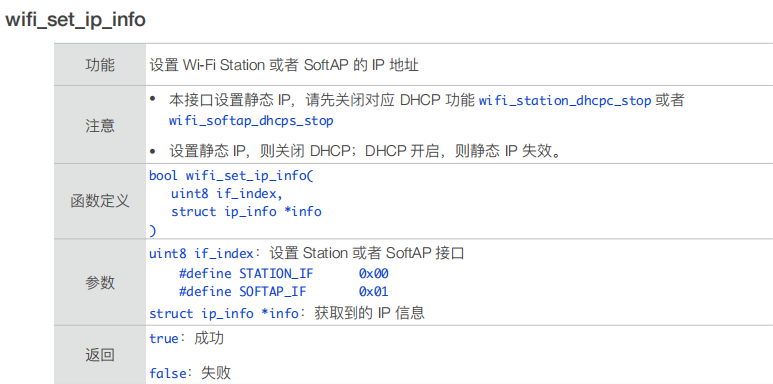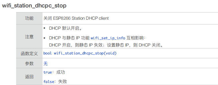 注意: 设置静态 IP,请先关闭对应 DHCP 功能 wifi_station_dhcpc_stop 或者