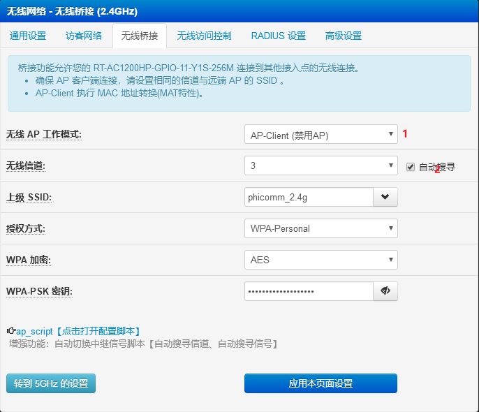 首先将上级路由(这里也就是主路由)设置好,使用的是一台K2,SSID是phicomm_2.4g , phicomm_5g。