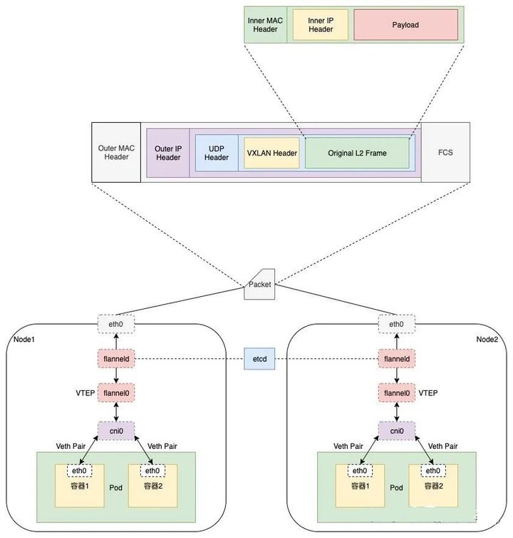 而 Overylay 在 Kubernetes 中容器跨主机网络通信中一样扮演者很重要的作用,其中比较主流的方案是基于 Flannel 的 VXLAN 后端实现,而 VXLAN 是 Overylay 网络的一种技术实现