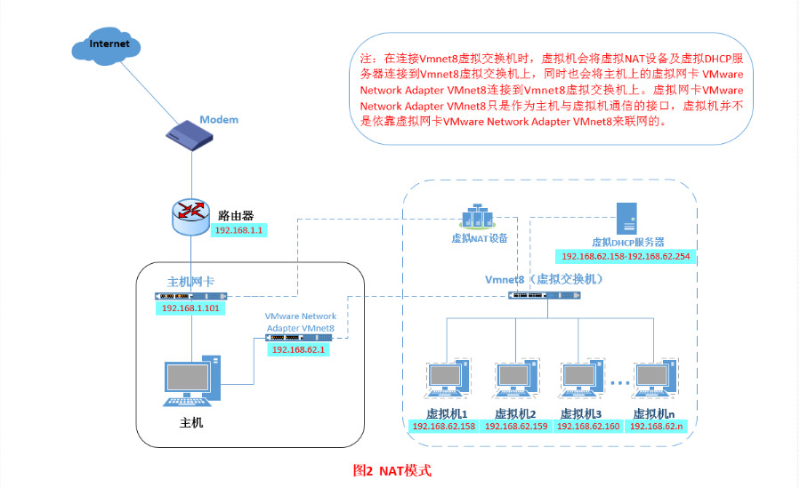 依靠物理主机的VMnet8网卡上网。虚拟机可以互Ping通,前提是物理主机的VMnet8网卡的网关要与虚拟机一样!如果不在同一个网关,会出现虚拟机能Ping通物理主机,但物理主机无法Ping通虚拟机的情况。注意此种情况也是实际应用场景之一。
