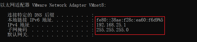 - NAT模式:使用Vmnet8网卡,宿主机和虚拟机可以互相通信,但局域网环境中其他主机/终端设备不能访问虚拟机,因为IP不在同一个网段。需要注意的是在该模式下虚拟机的子网掩码、网关、DNS要与网卡保持一致。适用场景:IP地址紧张的情况以及用来学习研究使用