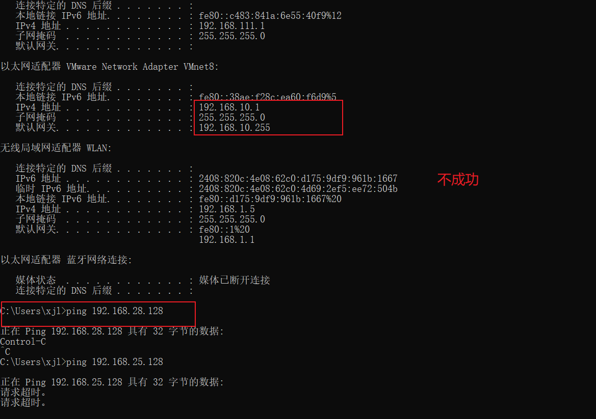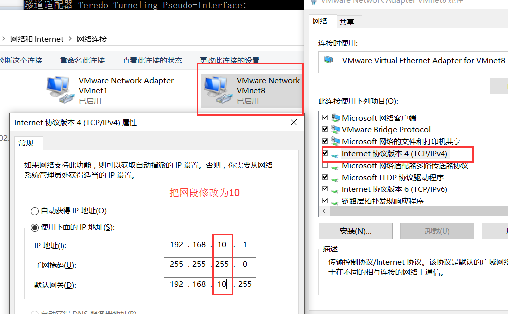 现修改物理主机网段为10,使其与虚拟机不同。