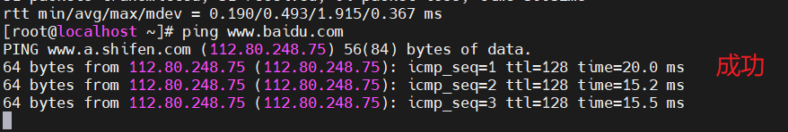然后,进入系统编辑网卡配置文件,命令为vi /etc/sysconfig/network-scripts/ifcfg-eth0。编辑完成,保存退出,然后重启虚拟机网卡,使用ping命令ping外网ip,测试能否联网。 能ping通外网ip,证明桥接模式设置成功。