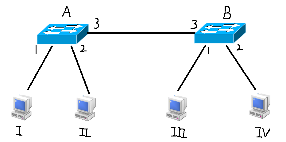 - 主机Ⅳ收到广播之后就会回应,交换机B会记录主机Ⅳ的MAC地址和对应的端口号,然后查看目标主机的MAC地址,从对应的端口发送出去(这个是在之前的MAC地址表已经记录了主机Ⅰ的MAC地址)交换机A也会记录主机Ⅳ的MAC地址和对应的端口。