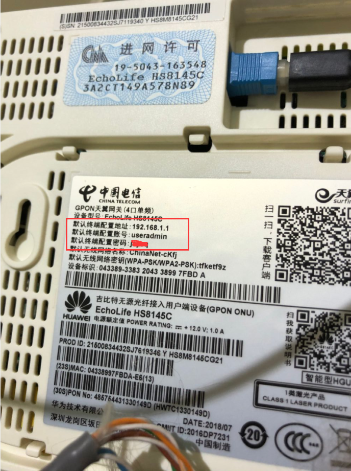 首先查看家里的光猫背后,找到天翼网关的配置地址(192.168.1.1)、账号(useradmin)和密码(******),如下图所示: