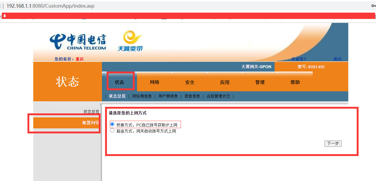 登录成功后,在“状态”-》“配置向导”中设置连接模式,默认是路由方式,下图是博主修改为桥接方式后的截图。