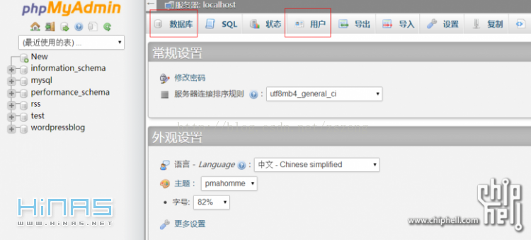 当安装完phpMyAdmin后请登录http://你NAS的私网IP/phpMyAdmin/来新建一个给Tiny Tiny RSS用的账号和数据库(非必须,你也可以使用管理员账号和现有数据库,但分开的话管理起来方便点)。