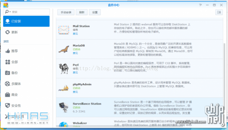 2、在套件中心安装MariaDB和phpMyAdmin。Tiny Tiny RSS需要PHP5.3以上版本和MySQL数据库的支持,这两样东西其实群辉都已经内置了,你需要做的事情只是给Tiny Tiny RSS新建一个专用的数据库。这需要用到phpMyAdmin。