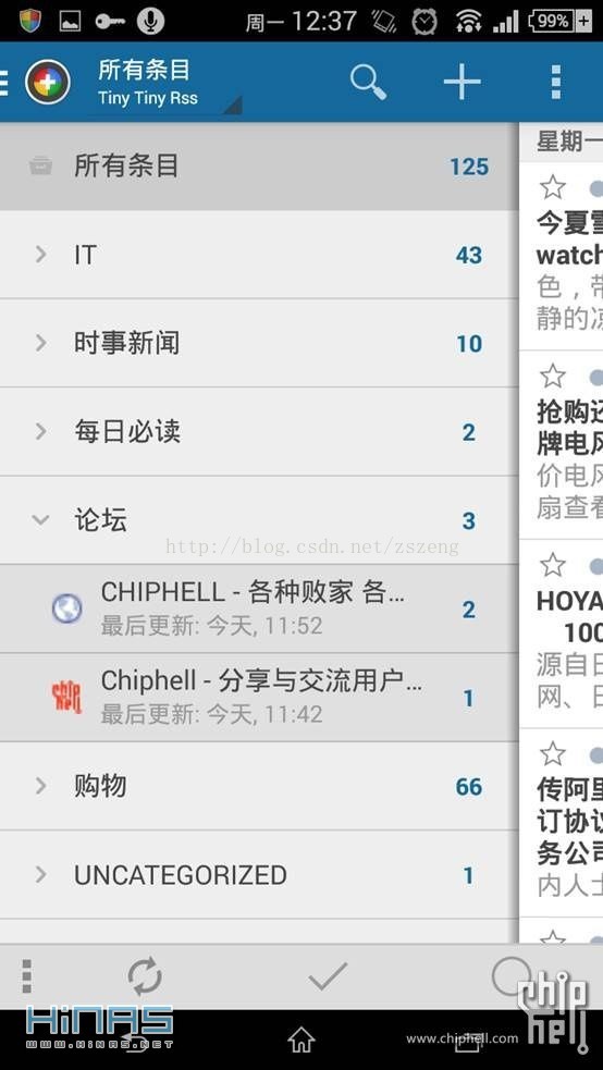 然而,只有网页阅读器怎么行,平时我可是一直和手机作伴,周到的TTRSS支持API存取,可以方便的调用第三方手机RSS APP来订阅。