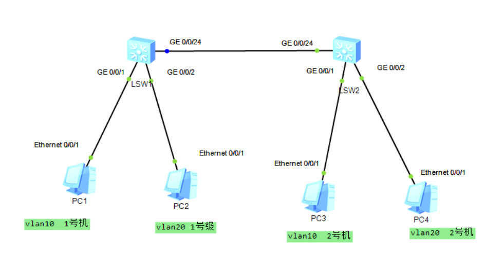 0/0/24端口给 vlan10,vlan20,同时将其设定为trunk状态