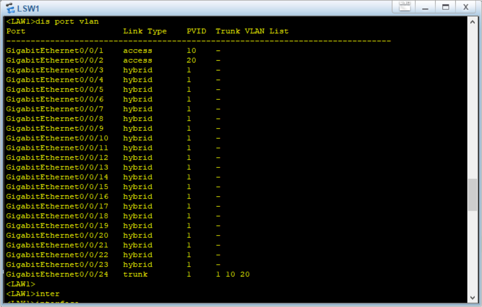 LSW2中设定同上。每个LSW运行dis port vlan 出现下图,即配置成功