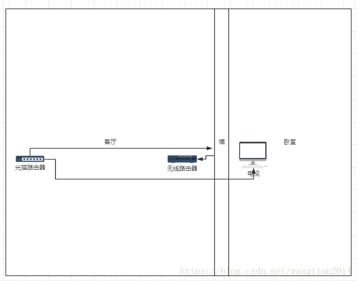 我加的网线布局是上图这样,光纤的弱电箱在客厅的一侧,另一侧是电视背景墙,墙的另一面是卧室。
