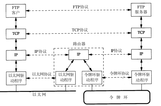 互联网的目的之一是在应用程序中隐藏所有的物理细节。虽然这一点在上图由两个网络组成的互联网中并不很明显,但是应用层不能关心(也不关心)一台主机是在以太网上,而另一台主机是在令牌环网上,它们通过路由器进行互连。随着增加不同类型的物理网络,可能会有2 0个路由器,但应用层仍然是一样的。物理细节的隐藏使得互联网功能非常强大,也非常有用。