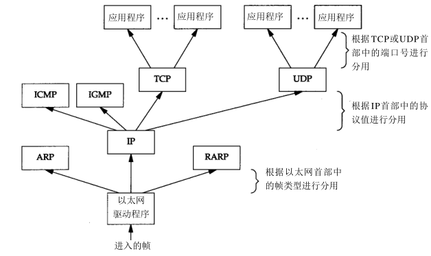 用户数据经过各层都会打上标识,添加上头部。其中IP首部会标识数据的协议类型:TCP、UDP、ICMP、IGMP中的一种。 IP在首部中存入一个长度为8 b i t的数值,称作协议域。 1表示为ICMP协议,2表示为IGMP协议,6表示为TCP协议,17表示为UDP协议。类似地,许多应用程序都可以使用 T C P或U D P来传送数据。运输层协议在生成报文首部时要存入一个应用程序的标识符。 T C P和U D P都用一个1 6 b i t的端口号来表示不同的应用程序。T C P和U D P把源端口号和目的端口号分别存入报文首部中。网络接口分别要发送和接收 I P、A R P和R A R P数据,因此也必须在以太网的帧首部中加入某种形式的标识,以指明生成数据的网络层协议。为此,以太网的帧首部也有一个 16 bit的帧类型域。
