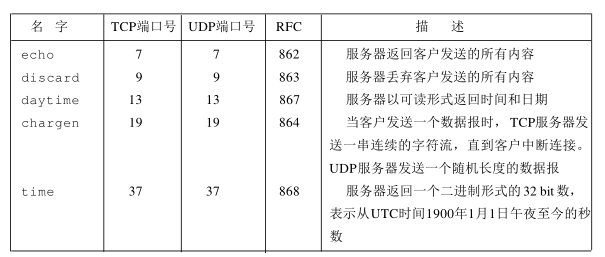 前面已经指出过,TCP和UDP采用16 bit的端口号来识别应用程序。服务器一般都是通过知名端口号来识别的。例如:FTP:21(TCP),Telnet:23(TCP),TFTP:69(UDP)。注意TCP和UDP端口是独立的,即一个端口TCP使用了,UDP仍然可以用。任何T C P / I P实现所提供的服务都用知名的 1~1 0 2 3之间的端口号。这些知名端口号由Intenet号分配机构来管理。大于1024的端口可以让用户来使用。但是这种规则只是对大多数操作系统而言,也会有例外。一些服务进程使用端口示例: