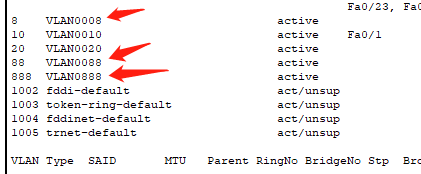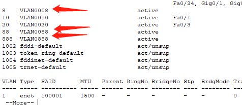 我们在交换机0上面创建vlan8 88 888 看看交换机1会不会学习