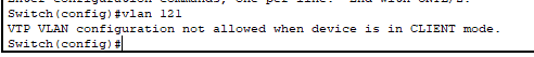下面我将交换机1改为client模式(只能学习不能自己玩自己)并在交换机1上面创建vl 121 看看能否会成功。