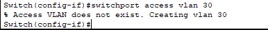 Switch(config-if)#switchport access vlan 30 将端口接入到vlan30