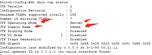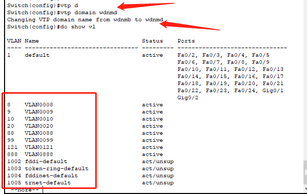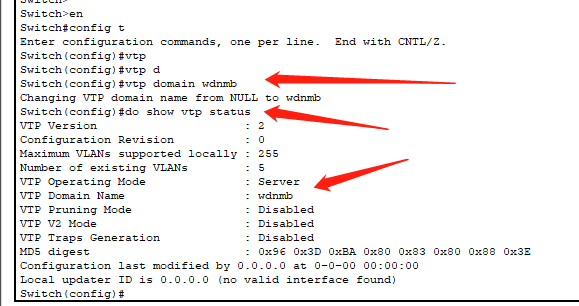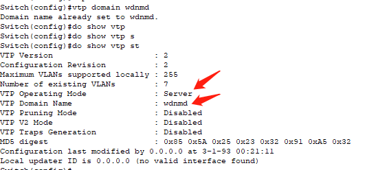 1.创建VTP域名:每台交换机上都要配置一个VTP域名,且必须一直,比如wdnmd(我带你们打)