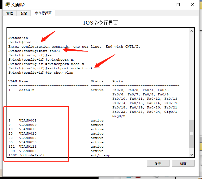 switchport trunk encapsulation dot1q/isl确定标签类型为802.1qlisl(本条命令(二层交换机)敲不上,模拟器不支持)