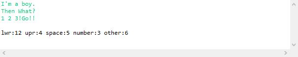 int lwr = 0, upr = 0, space = 0, number = 0, other = 0;