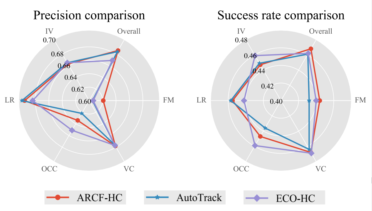 图8显示了三种最佳性能跟踪器在不同挑战下的能力比较,即, ARCF-HC跟踪器[24]、AutoTrack跟踪器[22]和ECOHC跟踪器[95]。就每个属性而言,OCC和FM两个属性下的三个跟踪器的性能都比IV、LR和VC差,说明遮挡和快速运动两大跟踪场景目前在UA V跟踪中更具挑战性。就三种追踪器而言,在成功率的比较中,三者在总体和VC上的表现相似,而ECO追踪器[95]在IV、LR和OCC上成功率更高,并且ARCF-HC跟踪器在OCC上更好。与ECO-HC追踪器相比,ARCF-HC追踪器和AutoTrack追踪器在LR方面都做得更好。在精度比较中,三者在IV中的差异很小,而ARCF-HC跟踪器[24]和AutoTrack跟踪器[22]的整体精度明显高于ECO-HC跟踪器[95]。ARCF-HC、AutoTrack和ECO-HC追踪器分别在FM、LR和OCC下更精确。