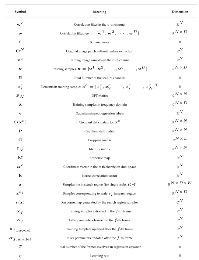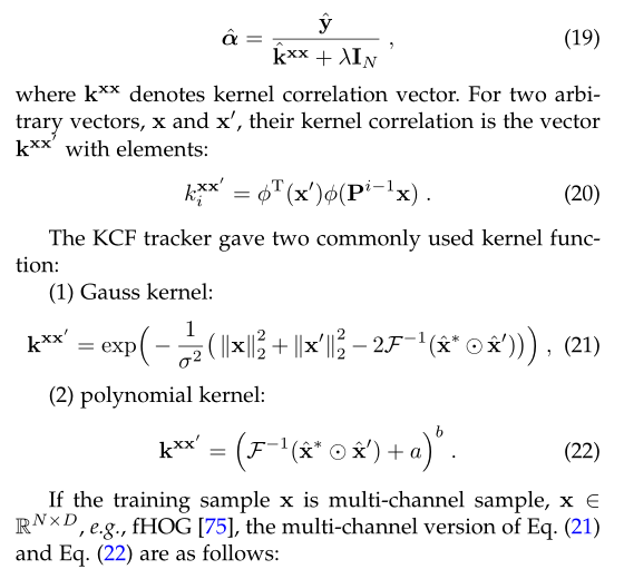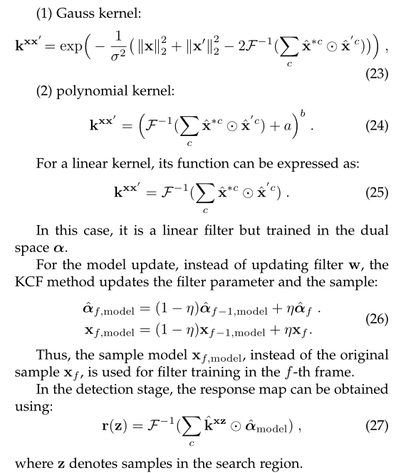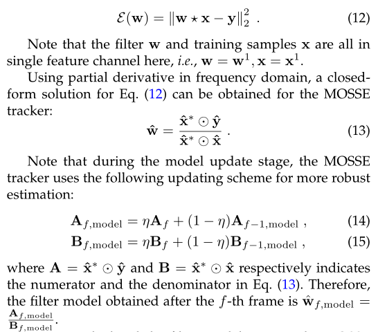 表示逐元素乘法,上标*表示复共轭。作为所有基于DCF的跟踪器的共同亮点,通过用高效的逐元素乘法来代替该操作,结果可以大大降低计算复杂度。