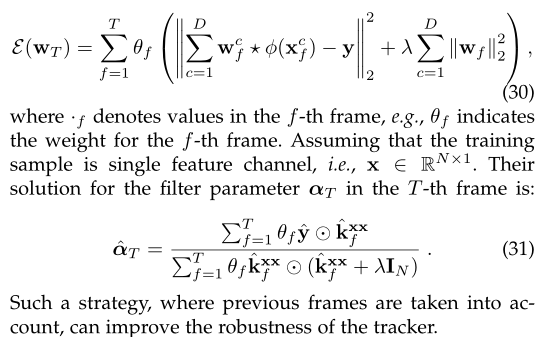 F.李等人提出了时空正则化相关滤波器(STRCF) [66],它在SRDCF跟踪器[90]以前的主要训练公式基础上引入了时间正则项,即Eq。(40)在SRDCF跟踪器的基础上,抑制过度的短期物体外观变化,获得更稳定的跟踪效果: