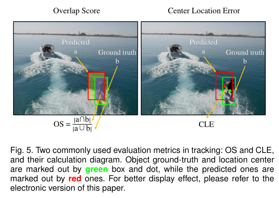 这里介绍了目标跟踪中常用的两个权威和客观的评估指标,即基于一遍评估(OPE)的中心位置误差(CLE)和重叠分数(OS)[28]。