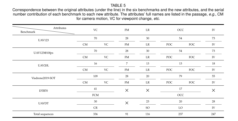 每个基准的原始属性首先被映射到五个属性,并且每个序列被重新标记。对于UAV123,UAV123@10fps,UAV20L,和Visdrone2019-SOT,它们的原始属性是一样的。它们的相机运动和视点变化的属性被分类为VC。原始属性快速运动、低分辨率和照明变化与本作品中的相同,即FM、LR和IV。部分闭塞和完全闭塞被分类为OCC。对于DTB70,其原始属性快速相机运动被分类为VC,遮挡在本工作中被分类为OCC。对于UAVDT,它们的属性“相机旋转”、“小对象”、“光照变化”和“大遮挡”分别对应于VC、LR、IV和OCC。表5显示了六个基准中的原始属性和新属性之间的对应关系,以及每个基准对每个新属性的序列号贡献。